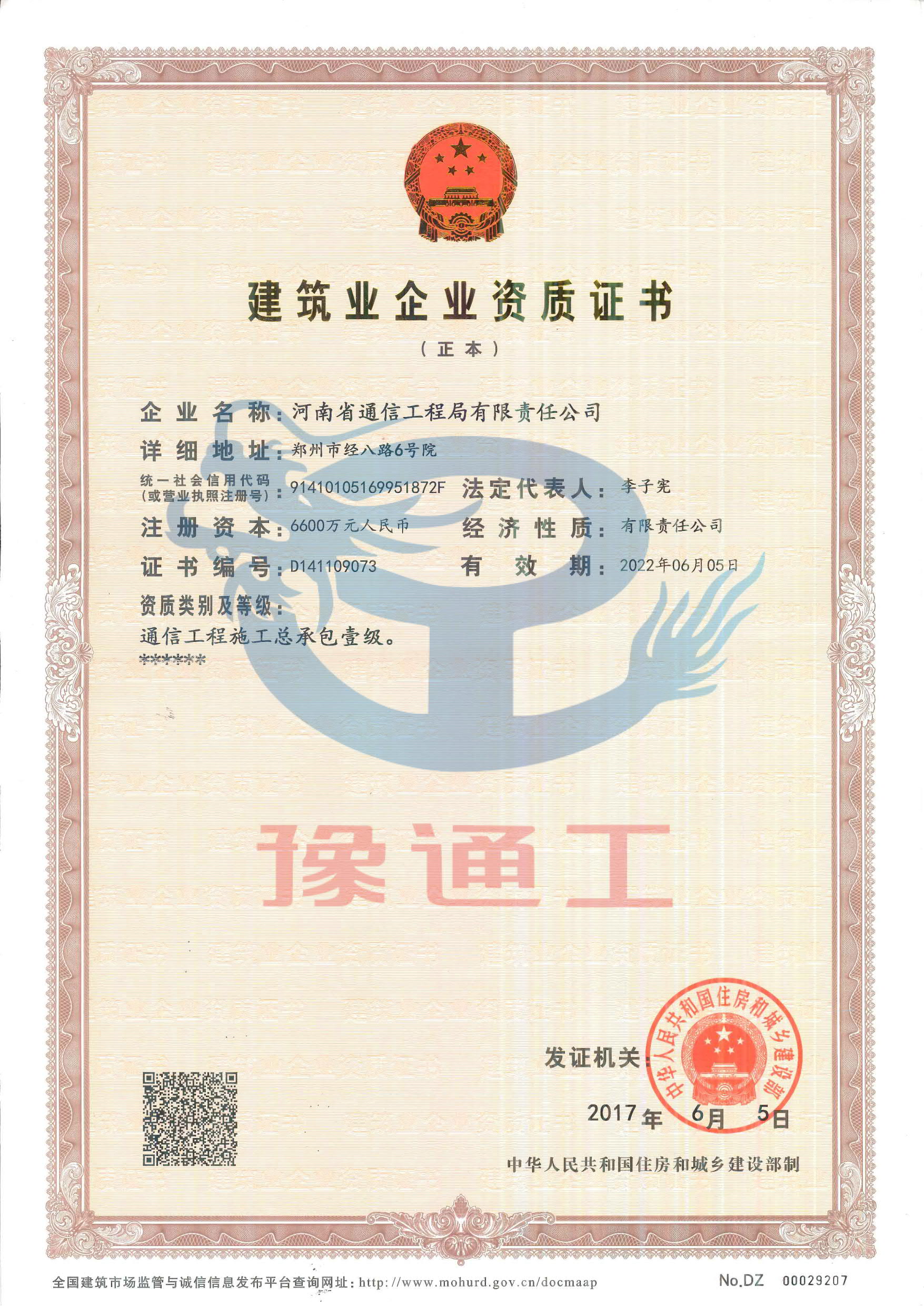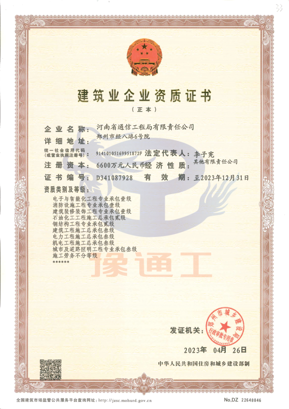 電子與智能化、建筑裝修裝飾、消防設(shè)施工程專業(yè)承包壹級(jí);鋼結(jié)構(gòu)工程專業(yè)承包貳級(jí);建筑工程、電力工程、機(jī)電工程、城市及道路照明工程專業(yè)施工總承包叁級(jí);施工勞務(wù)不分等級(jí)。